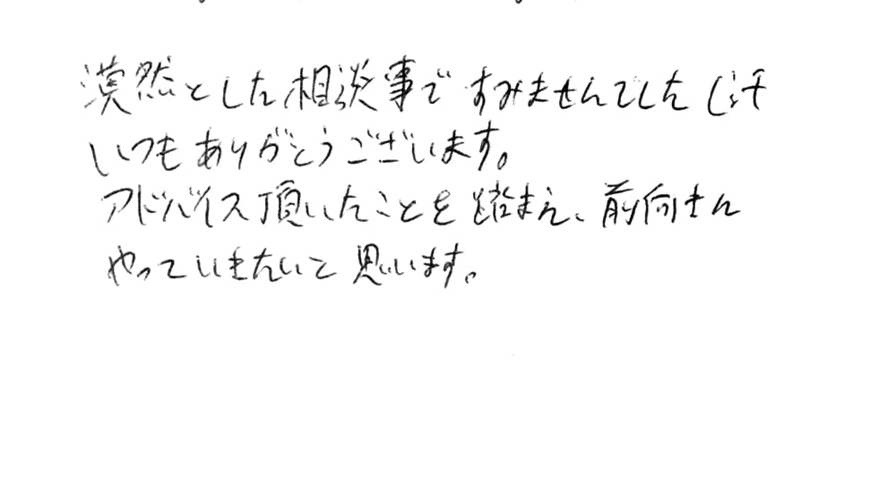 お客様より鑑定のご感想をいただきました。 ありがとうございます! 【ご感想】 漠然とした相談事ですみませんでした(汗 いつもありがとうございます。 アドバイスいただいたことを踏まえ 前向きにやって行きたいと思います。 (S様 20代男性) ★鑑定スケジュールはトップページから ★お客様からいただいたご感想一覧はこちら