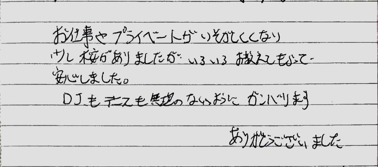 お客様より、鑑定のご感想をいただきました。 ありがとうございます! 【ご感想】 お仕事やプライベートが忙しくなり すこし不安がありましたが、 色々教えてもらって 安心しました。 DJもテニスも無理のないようにガンバリます。 ありがとうございました。 (M様 40代男性) ありがとうございました。 素敵な未来になりますよう、願っております꙳★*゚ KURARA