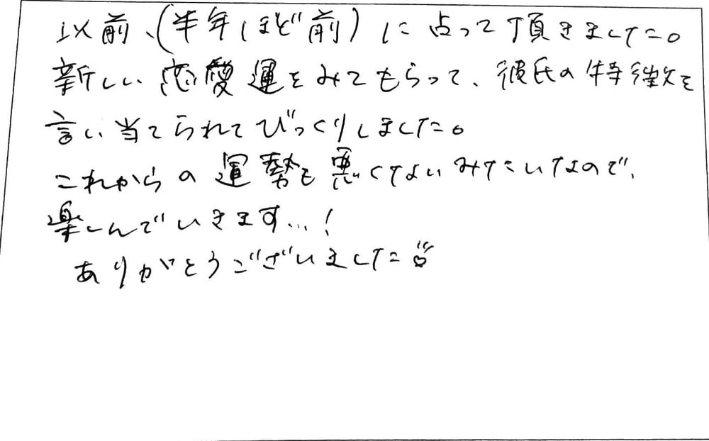 お客様から鑑定のご感想をいただきました。 ありがとうございます。 ご感想 以前(半年ほど前)に占っていただきました。 新しい恋愛運を見てもらって、彼氏の特徴を言い当てられてびっくりしました。 これからの運勢も悪くないみたいなので、楽しんでいきます! ありがとうございました♥ (C様 20代女性) ありがとうございました。...