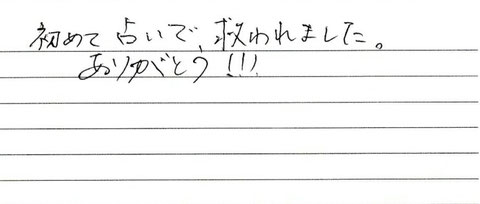 2018/06/10 「救われました」(20代男性) お客様より占いのご感想をいただきましたのでご紹介いたします。 ご感想(Kさま 20代/男性/接客販売業) 初めて占いで救われました。 ありがとう!! Kさま、ありがとうございます! tagPlaceholderカテゴリ: お客様のご感想