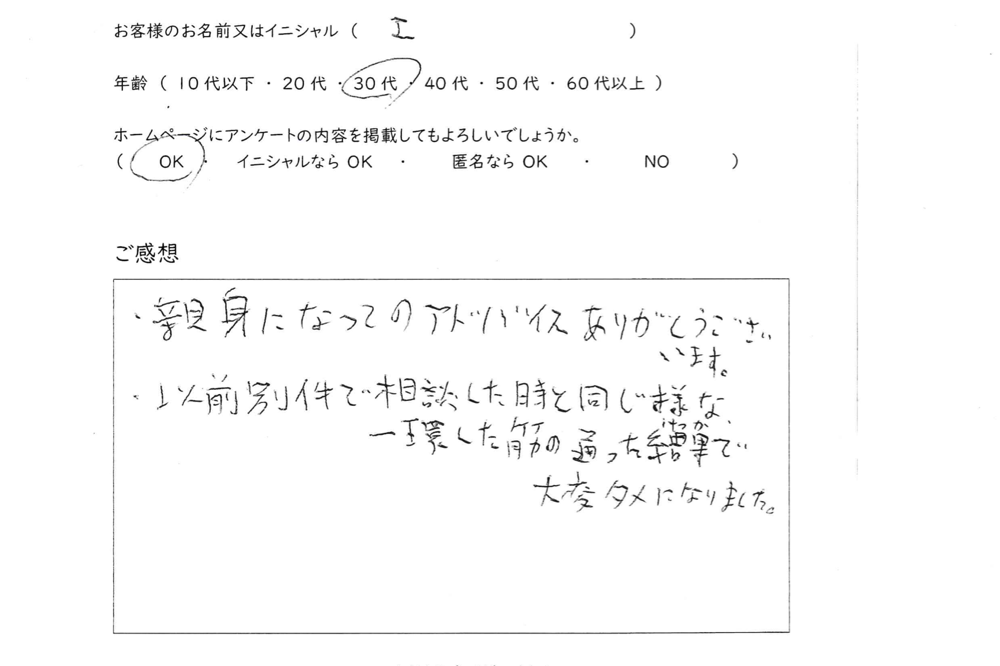 お客様のご感想 · 2018/09/03 「筋の通った結果で大変ためになりました」 お客様より鑑定のご感想をいただきました。 I さま、ありがとうございます。 【ご感想】 親身になってのアドバイス ありがとうございます。 以前別件で相談した時と同じような、一貫した筋の通った結果で 大変ためになりました。 tagPlaceholderカテゴリ: お客様のご感想