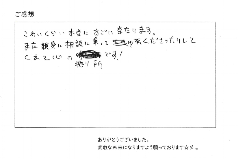 お客様のご感想 · 2018/09/20 「こわいくらい本当にすごい当たります」 お客様より占いのご感想をいただきました。 有難うございました。 ご感想(T.Kさま 20代) こわいくらい本当にすごい当たります。 また親身に相談に乗ってくださったりして心の拠り所です! tagPlaceholderカテゴリ: お客様のご感想
