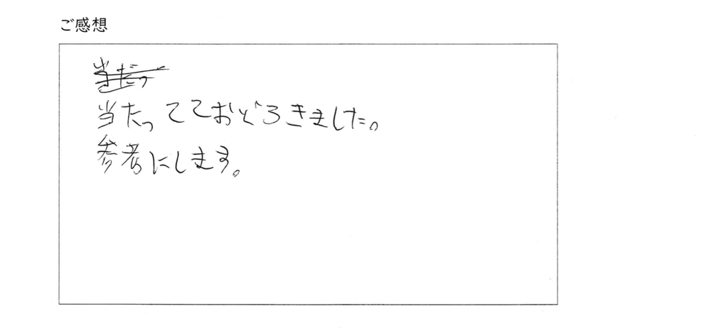 お客様のご感想 · 2018/11/27 「当たってて驚きました」 お客様より鑑定のご感想を頂きました。 H様 ありがとうございます! 【ご感想】 当たってて驚きました。 参考にします。 (20代 男性 H様) ★鑑定スケジュールはトップページから ★お客様からいただいたご感想はこちら tagPlaceholderカテゴリ: お客様のご感想