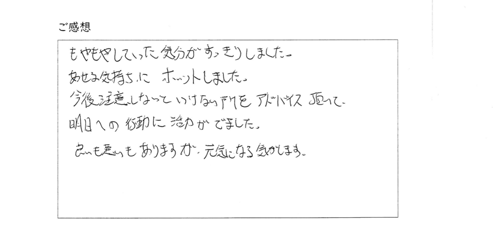 お客様のご感想 · 2018/11/30 「焦る気持ちがホッとしました」 お客様より鑑定のご感想をいただきました。 Tさま ありがとうございます! 【ご感想】 モヤモヤしていた気分がすっきりしました。 あせる気持ちにホッとしました。 今後注意しないといけないところをアドバイス頂いて、 明日への行動に活力がでました。 良いも悪いもありますが元気になる気がします。 (40代男性 Tさま) ★鑑定スケジュール等はトップページから ★お客様からいただいたご感想はこちら tagPlaceholderカテゴリ: お客様のご感想
