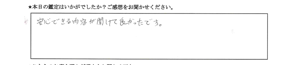 お客様のご感想 · 2019/01/13 「よかったです」 お客様より鑑定のご感想をいただきました。 Tさま ありがとうございます。 【ご感想】 安心できる内容が聞けて良かったです。 (Tさま 男性 30代) ★鑑定スケジュール等はトップページから ★お客様からいただいたご感想はこちら tagPlaceholderカテゴリ: お客様のご感想