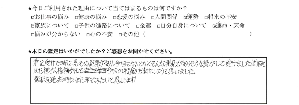 お客様のご感想 · 2019/01/17 「行動方針にしようと思いました」 お客様より鑑定のご感想をいただきました。 Mさま ありがとうございます。 【ご感想】 前回受けた時に思わぬ発見があり、今回もなんとなくそんな発見がありそうな気がして受けました! 前回と似たような指摘が出て、今回の行動方針にしようと思いました。 選択を迷った時にまた来てみたいと思います! ( Mさま 女性 20代 ) ★鑑定スケジュール等はトップページから ★お客様からいただいたご感想はこちら tagPlaceholderカテゴリ: お客様のご感想