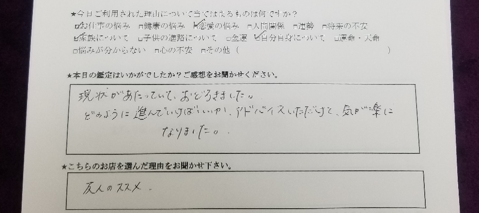 お客様のご感想 · 2019/01/26 「当たっていて驚きました」 お客様より鑑定のご感想をいただきました。 ありがとうございます! 【ご感想】 現状が当たっていて驚きました。 どのように進んでいけばよいか、アドバイスをいただけて、 気が楽になりました。 (20代 女性 Kさま) ★鑑定スケジュールはトップページから ★お客様からいただいたご感想一覧はこちら tagPlaceholderカテゴリ: お客様のご感想
