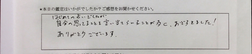 お客様のご感想 · 2019/02/20 「おどろきました!」 お客様より鑑定のご感想をいただきました。 ありがとうございます! 【ご感想】 はじめての占いでしたが、 自分の思っていることを言い当てられることが多く、 おどろきました! ありがとうございます。 (Tさま 30代男性) ★鑑定スケジュールはトップページから ★お客様からいただいたご感想一覧はこちら tagPlaceholderカテゴリ: お客様のご感想