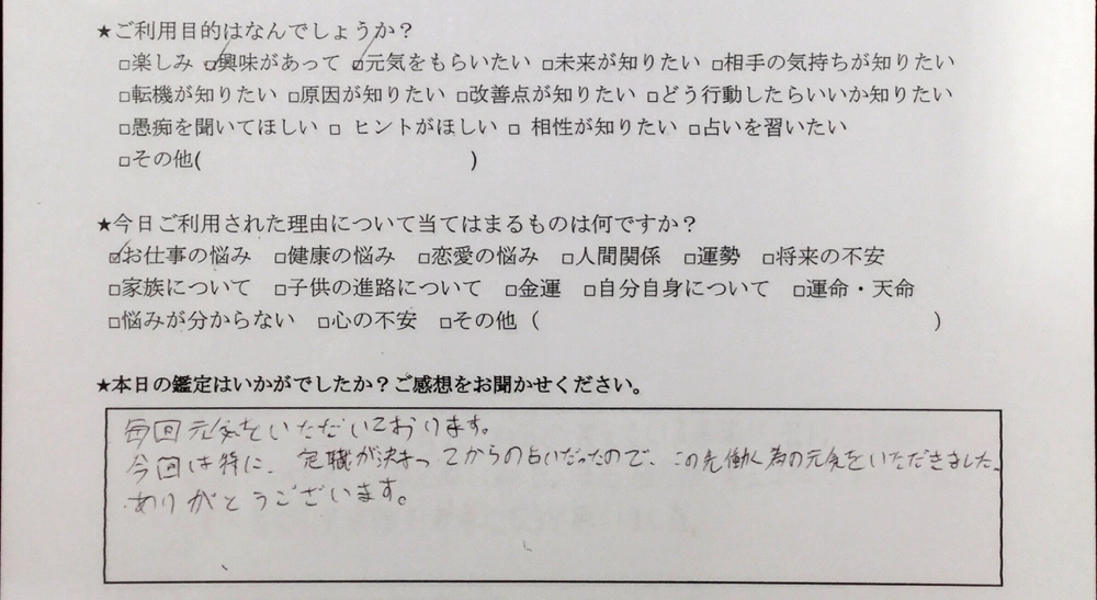 お客様のご感想 · 2019/02/17 「元気をいただきました」 お客様より鑑定のご感想をいただきました。 ありがとうございます! 【ご感想】 毎回元気を頂いております。 今回は特に、定職が決まってからの占いだったので、 この先働くための元気をいただきました。 ありがとうございます。 (Zさま 20代男性) ★鑑定スケジュールはトップページから ★お客様からいただいたご感想一覧はこちら tagPlaceholderカテゴリ: お客様のご感想