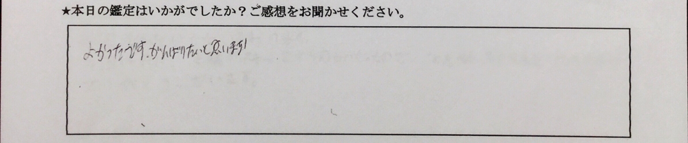 お客様のご感想 · 2019/02/18 「頑張りたいとおもいます」 お客様より鑑定のご感想をいただきました。 ありがとうございます! 【ご感想】 良かったです。 がんばりたいと思います! (K.G さま 40代男性) ★鑑定スケジュールはトップページから ★お客様からいただいたご感想一覧はこちら tagPlaceholderカテゴリ: お客様のご感想
