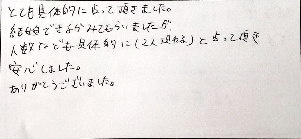 お客様のご感想 · 2019/03/22 「安心しました」 お客様より鑑定のご感想をいただきました。 ありがとうございます! 【ご感想】 とても具体的に占って頂きました。 結婚できるか見てもらいましたが、 人数など具体的に占って頂き安心しました。 ありがとうございました。 (K様 20代女性) ★鑑定スケジュールはトップページから ★お客様からいただいたご感想一覧はこちら tagPlaceholderカテゴリ: お客様のご感想