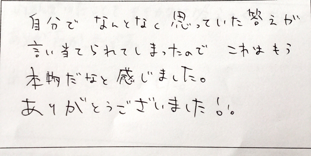 お客様のご感想 · 2019/03/23 「本物だなと感じました」 お客様より鑑定のご感想をいただきました。 ありがとうございます! 【ご感想】 自分でなんとなく思っていた答えが言い当てられてしまったので これはもう本物だなと 感じました。 ありがとうございました!! (Nさま 30代女性) ★鑑定スケジュールはトップページから ★お客様からいただいたご感想一覧はこちら tagPlaceholderカテゴリ: お客様のご感想