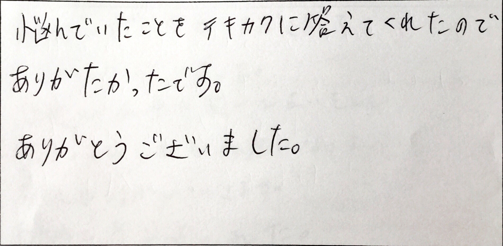 お客様のご感想 · 2019/03/24 「的確に答えてくれた」 お客様より鑑定のご感想をいただきました。 ありがとうございます! 【ご感想】 悩んでいたことを的確に答えてくれたので ありがたかったです。 ありがとうございました。 (R様 30代女性) ★鑑定スケジュールはトップページから ★お客様からいただいたご感想一覧はこちら tagPlaceholderカテゴリ: お客様のご感想