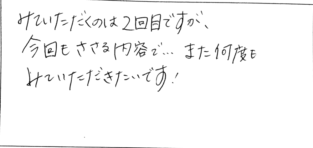 お客様のご感想 · 2019/04/27 「何度もみていただきたいです」 お客様より鑑定のご感想をいただきました。 ありがとうございます! 【ご感想】 見たいただくのは2回目ですが、 今回もささる内容で… また何度もみていただきたいです! (F様 20代女性) ★鑑定スケジュールはトップページから ★お客様からいただいたご感想一覧はこちら tagPlaceholderカテゴリ: お客様のご感想
