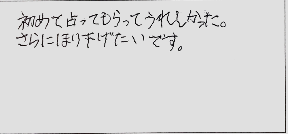 お客様のご感想 · 2019/07/15 「初めて占ってもらった」 お客様より鑑定のご感想をいただきました。 ありがとうございます! 【ご感想】 初めて占ってもらってうれしかった。 さらに掘り下げたいです。 (女性 Hさま) ★鑑定スケジュールはトップページから ★お客様からいただいたご感想一覧はこちら tagPlaceholderカテゴリ: お客様のご感想