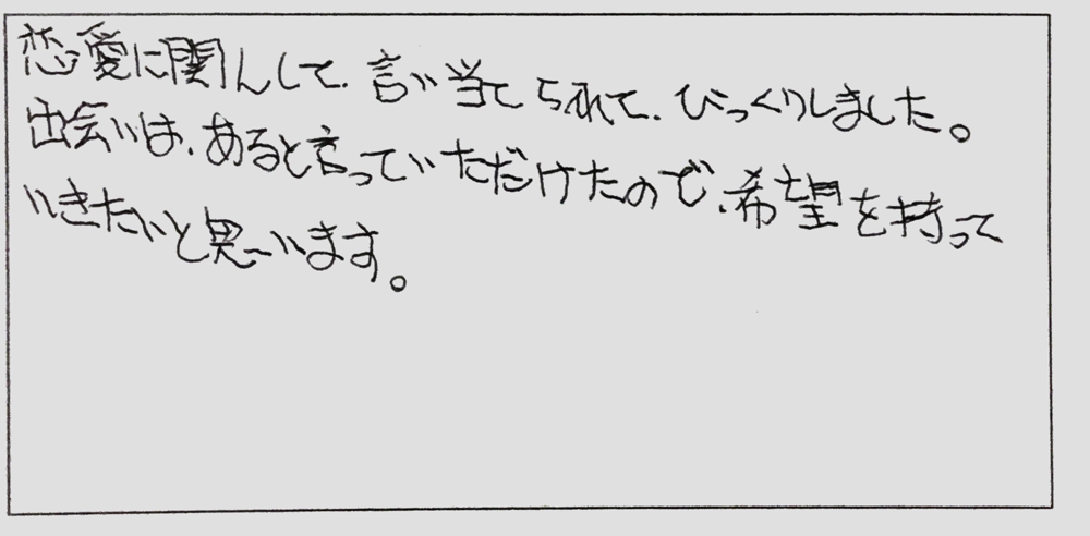 2019/07/17 「言い当てられてびっくりしました」 お客様より鑑定のご感想をいただきました。 ありがとうございます! 【ご感想】 恋愛に関して言い当てられて びっくりしました。 出会いはあると言って頂けたので 希望を持っていきたいと思います。 (30代女性 Eさま) ★鑑定スケジュールはトップページから ★お客様からいただいたご感想一覧はこちら tagPlaceholderカテゴリ: お客様のご感想