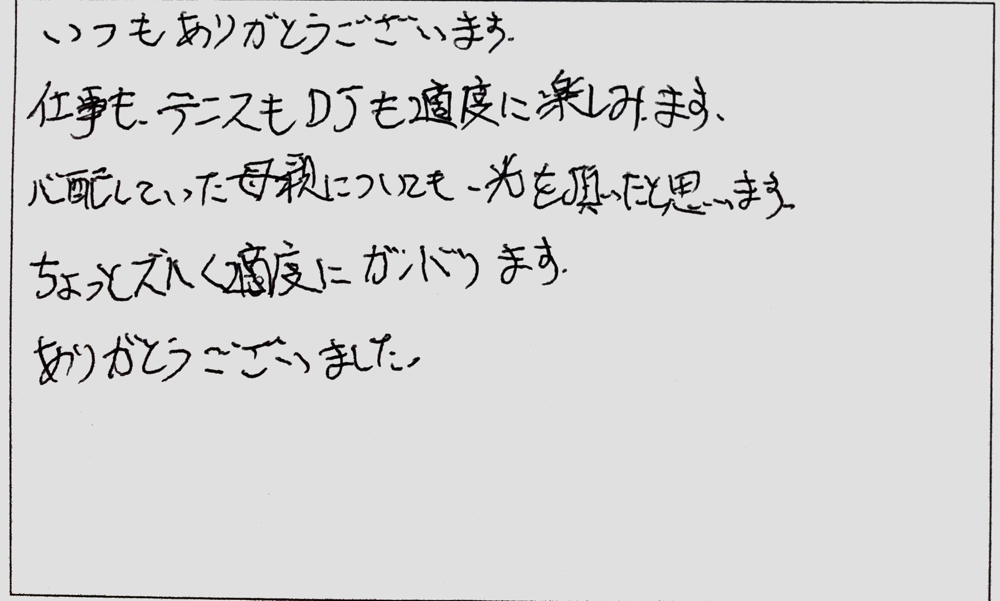 お客様のご感想 · 2019/08/20 「光をいただいた」 お客様より鑑定のご感想をいただきました。 ありがとうございます! 【ご感想】 いつもありがとうございます、 仕事も テニスも DJも 適度に楽しみます。 心配していた母親についても 光を頂いたと思います。 ちょっとズルく 適度にがんばります。 ありがとうございました。 (K様 40代 男性) ★鑑定スケジュールはトップページから ★お客様からいただいたご感想一覧はこちら tagPlaceholderカテゴリ: お客様のご感想
