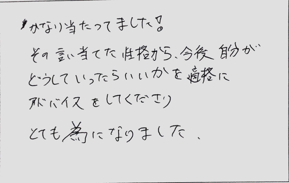 お客様のご感想 · 2019/09/06 「かなり当たってました!」 お客様より鑑定のご感想をいただきました。 ありがとうございます! 【ご感想】 かなり当たってました! その言い当てた性格から、 今後自分がどうしていったらいいかを 的確にアドバイスしてくださり とても為になりました! (U様 20代 男性) ★鑑定スケジュールはトップページから ★お客様からいただいたご感想一覧はこちら tagPlaceholderカテゴリ: お客様のご感想