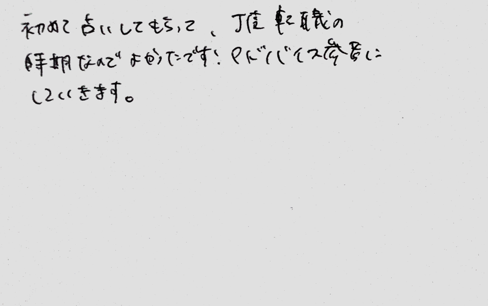 お客様のご感想 · 2019/11/05 「よかったです」 お客様より鑑定のご感想をいただきました。 ありがとうございます! 【ご感想】 初めて占いをしてもらって 丁度転職の時期なので良かったです。 アドバイスを参考にしていきます。 (20代女性) ★鑑定スケジュールはトップページから ★お客様からいただいたご感想一覧はこちら tagPlaceholderカテゴリ: お客様のご感想