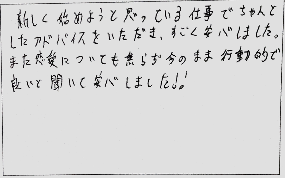 お客様のご感想 · 2019/11/09 「すごく安心しました」 お客様より鑑定のご感想をいただきました。 ありがとうございます! 【ご感想】 新しく始めようと思っている仕事で ちゃんとしたアドバイスを頂き すごく安心しました。 また恋愛についても 焦らず今のまま行動的で良いと聞いて 安心しました!! (M様 30代女性) ★鑑定スケジュールはトップページから ★お客様からいただいたご感想一覧はこちら tagPlaceholderカテゴリ: お客様のご感想